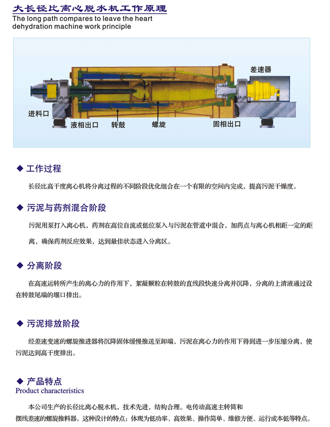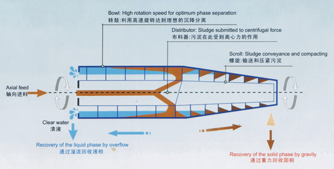 轉(zhuǎn)筒、螺旋推料器同向高速旋轉(zhuǎn),轉(zhuǎn)筒、螺旋推料器在差速器作用下速差為10-30轉(zhuǎn)/分。分離原液經(jīng)進(jìn)料口進(jìn)入高速轉(zhuǎn)動(dòng)的轉(zhuǎn)筒內(nèi),在離心力的作用下液體中質(zhì)量大的懸浮物迅速地向筒壁積聚。已分離的濾液由水層內(nèi)圈之出水孔經(jīng)出液口排出。沉渣由螺旋推料器推送到轉(zhuǎn)筒的圓錐端經(jīng)出渣口排出。