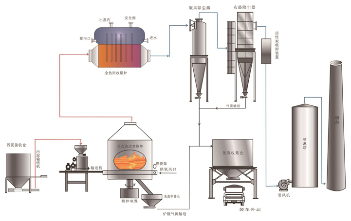 立式清潔焚燒爐系統(從冷風進口到熱風出口以及從濕料進口到灰渣出口止):包括“進料裝置,立式清潔焚燒爐,鼓風機,出渣系統,輔助燃燒器,動力裝置”等組成;